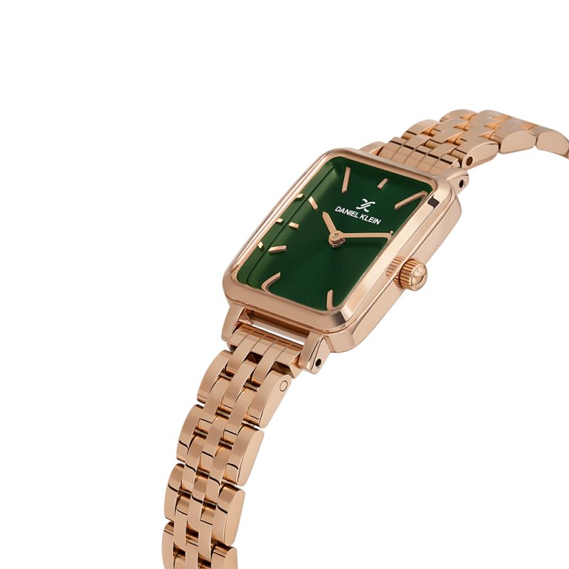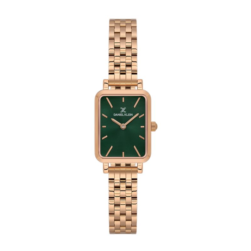 Стилен дамски часовник Daniel Klein от колекцията Premium. Тъмнозелен аналогов дисплей със стрелки и индекси  в цвят розово злато. Корпус изработен от метал. Верижка от неръждаема стомана. Задвижва се от кварцов механизъм. Водоустойчивост 3 ATM - допускат се леки пръски, не се препоръчва обилно мокрене.