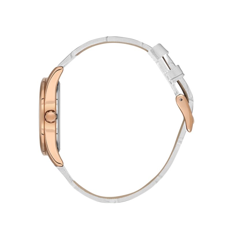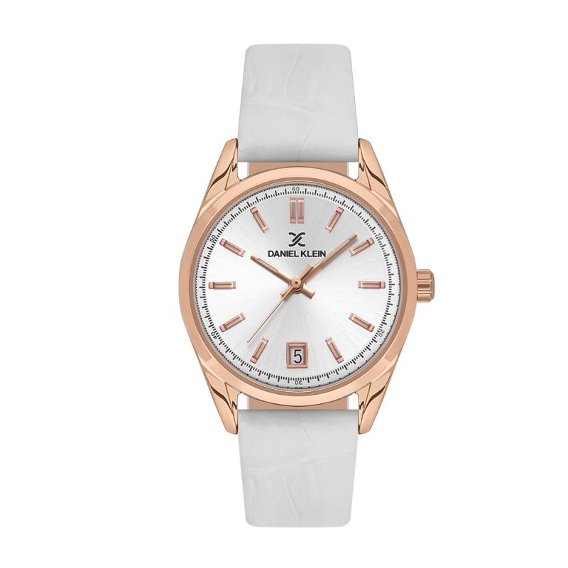 Класически модел дамски часовник Daniel Klein от колекцията Premium. Сребрист аналогов дисплей със семпъл дизайн и показател за дата. Стъкло минерал-кристал. Корпус изработен от метал. Бяла каишка от естествена кожа. Диаметър на корпуса 32 мм. Часовникът се задвижва от кварцов механизъм. Водоустойчивост 3 ATM - допускат се леки пръски, не се препоръчва обилно мокрене.