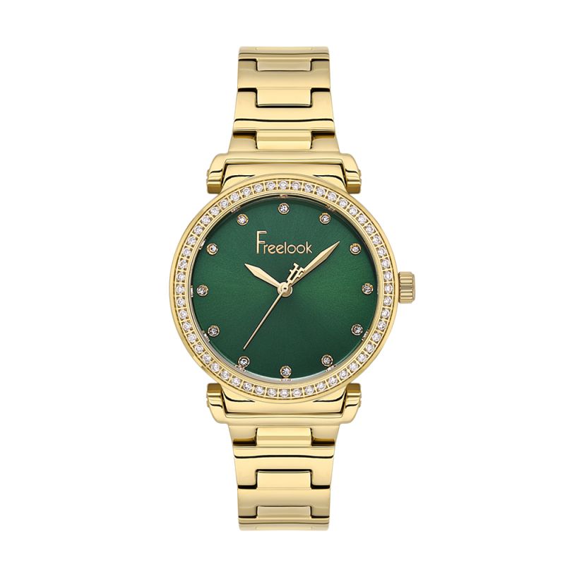 Класически модел дамски часовник Freelook със стилен дизайн от колекцията Lumiere. Аналогов дисплей в тъмнозелен цвят със златисти стрелки. Декорация от нежни кристали по безела и индексите. Стъкло минерал-кристал. Корпус и верижка изработени от неръждаема стомана. Диаметър на корпуса 32мм. Часовникът се задвижва от кварцов механизъм. Водоустойчивост 5 ATM - допускат се леки пръски и взимане на душ, не се препоръчва обилно мокрене.