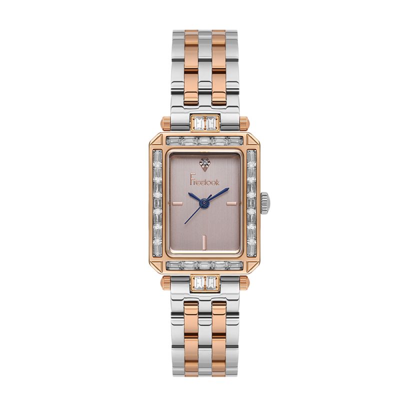 Красив дамски часовник Freelook със стилен дизайн от колекцията Charmant. Аналогов дисплей в цвят розово злато със сини стрелки и нежен кристал. Стъкло минерал-кристал. Корпус и верижка изработени от неръждаема стомана. Моделът е с богата декорация от бляскави кристали. Задвижва се от кварцов механизъм. Водоустойчивост 5 ATM - допускат се леки пръски и взимане на душ, не се препоръчва обилно мокрене.