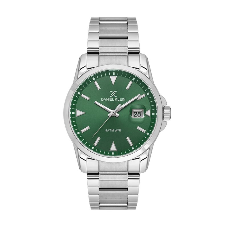 Мъжки часовник Daniel Klein с класически дизайн от колекцията Premium. Дисплеят е аналогов в зелен цвят с показател за дата. Луминесцентно покритие върху стрелките и индексите. Стъклото е минерал-кристал. Моделът е с метален корпус и верижка от неръждаема стомана. Диаметъра на корпуса е 42 мм. Часовникът се задвижва от кварцов механизъм. Водоустойчивост 5 ATM - допускат се леки пръски и взимане на душ, не се препоръчва обилно мокрене.