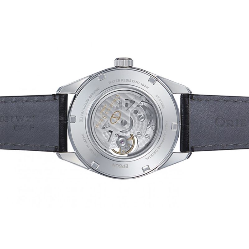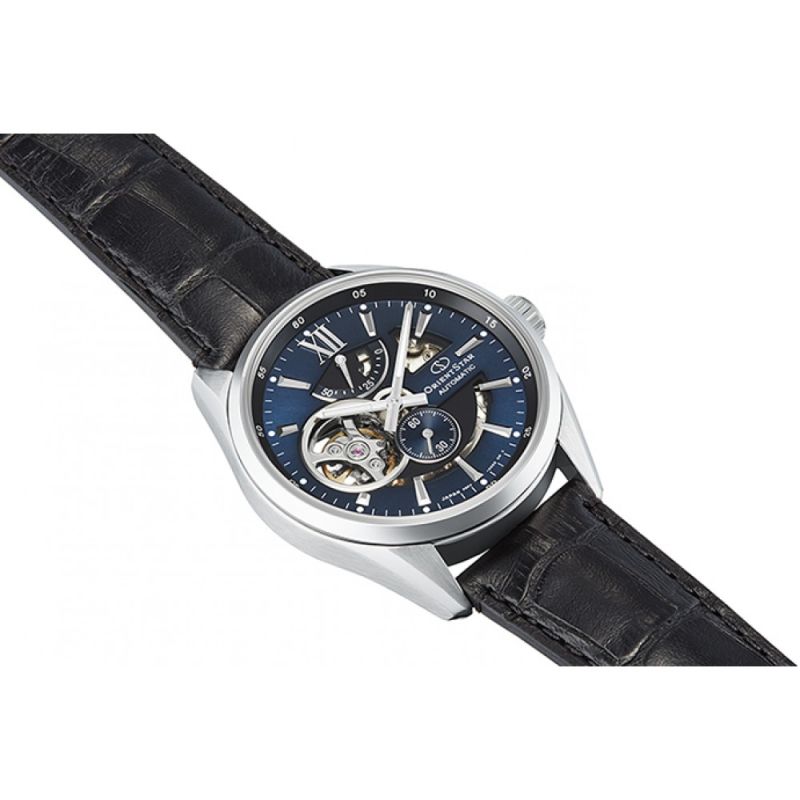 Елегантен мъжки часовник Orient Star. Корпус от неръждаема стомана, съчетан с каишка от естествена кожа. Син аналогов дисплей с отвор, позволяващ да се наблюдава част от механизма, индикатор за резервната мощност и отделен секундарник. Сапфирено стъкло с антирефлексно покритие. Задвижва се от автоматичен механизъм Cal. F6F44. Водоустойчивост 10 ATM - позволява мокрене, къпане и плуване във водни басейни.