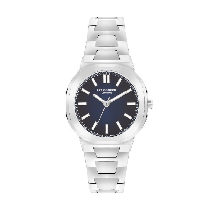 Дамски часовник Lee Cooper с класически дизайн. Син аналогов дисплей с луминисцентно покритие на стрелките и индексите. Стъкло минерал-кристал. Корпус от супер метал в комбинация с метална верижка. Задвижва се от кварцов механизъм. Водоустойчивост 3 ATM - допускат се леки пръски, не се препоръчва обилно мокрене.