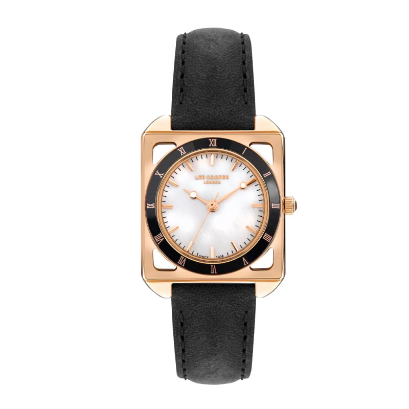 Дамски часовник Lee Cooper със спортно-елегантен дизайн. Моделът е с корпус от супер метал и кожена каишка. Седефен аналогов дисплей с детайли в цвят разово злато. Стъкло минерал-кристал. Задвижва се от кварцов механизъм. Водоустойчивост 3 ATM - допускат се леки пръски, не се препоръчва обилно мокрене.