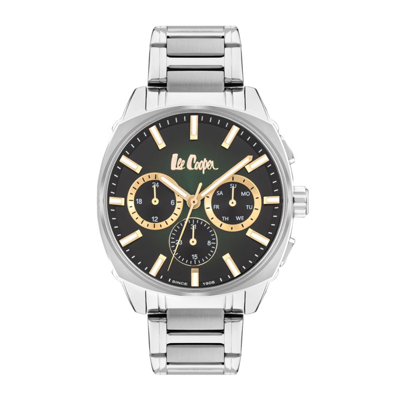 Мъжки часовник Lee Cooper със спортно-елегантен дизайн. Мултифункционален дисплей в зелен цвят със златисти детайли. Луминисцентно покритие върху стрелките и индексите. Стъкло минерал-кристал. Корпус от супер метал, в комбинация с метална верижка. Задвижва се от кварцов механизъм. Водоустойчивост 5 ATM - допускат се леки пръски и взимане на душ, не се препоръчва обилно мокрене.
