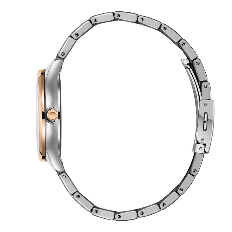 Дамски часовник Lee Cooper с класически дизайн. Моделът е с корпус от супер метал и верижка от неръждаема стомана. Сребрист аналогов дисплей със стрелки и индекси в цвят розово злато. Стъкло минерал-кристал. Задвижва се от кварцов механизъм. Водоустойчивост 3 ATM - допускат се леки пръски, не се препоръчва обилно мокрене.