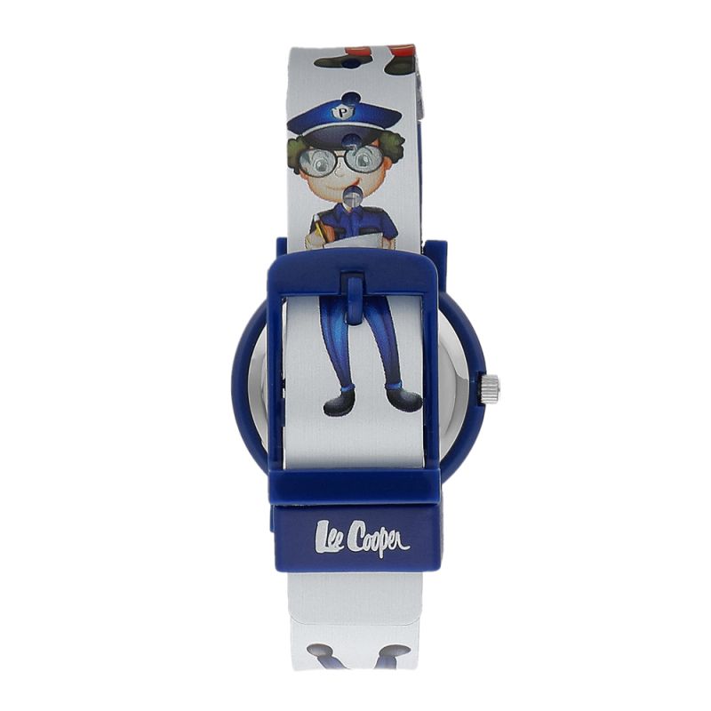Детски часовник Lee Cooper с цветен дизайн. Аналогов дисплей с изображение на полицейска кола. Стъкло минерал-кристал. Корпус от поликарбонат, съчетан със силиконова каишка. Задвижва се от кварцов механизъм. Водоустойчивост 3 ATM - допускат се леки пръски, не се препоръчва обилно мокрене.