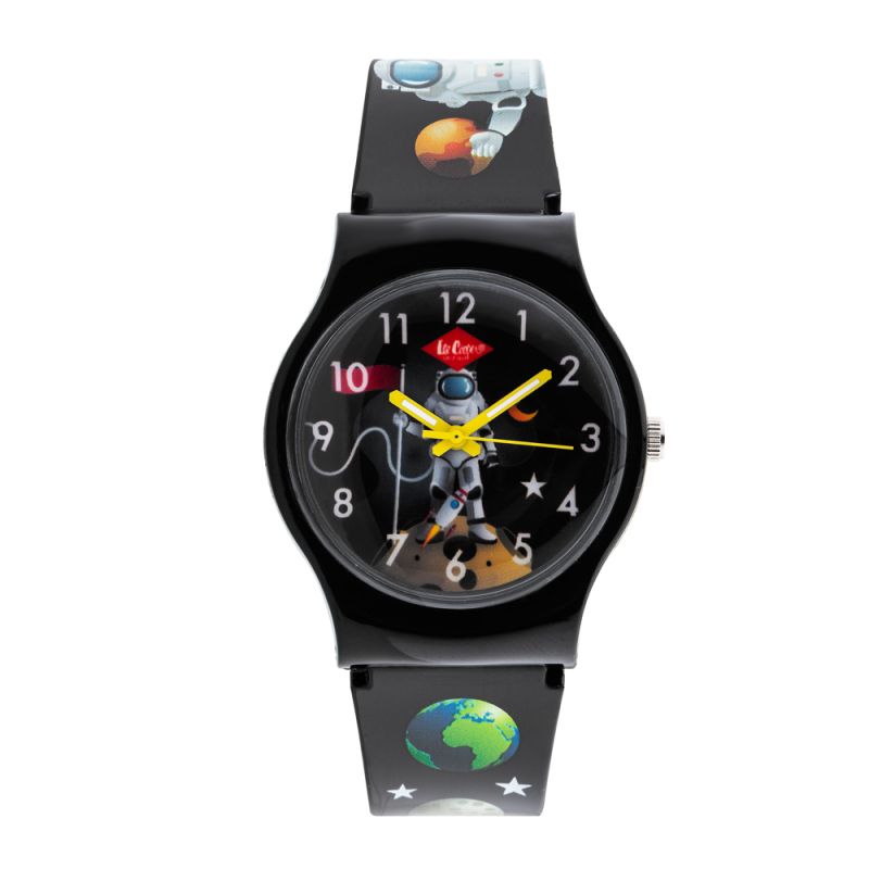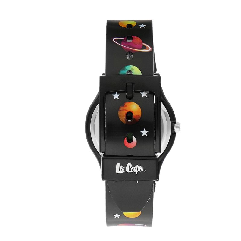 Детски часовник Lee Cooper с цветен дизайн на тема космос. Моделът е с аналогов дисплей и минерално стъкло. Корпус от поликарбонат, съчетан със силиконова каишка. Задвижва се от кварцов механизъм. Водоустойчивост 3 ATM - допускат се леки пръски, не се препоръчва обилно мокрене.