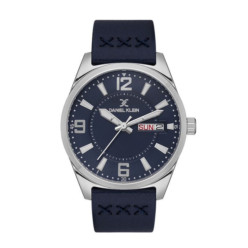 Мъжки часовник Daniel Klein със стилен дизайн от колекцията Premium. Метален корпус в комбинация с каишка от естествена кожа. Тъмносин аналогов дисплей с показател за дата и ден от седмицата. Стъкло минерал-кристал. Задвижва се от кварцов механизъм. Водоустойчивост 5 ATM - допускат се леки пръски и взимане на душ, не се препоръчва обилно мокрене.