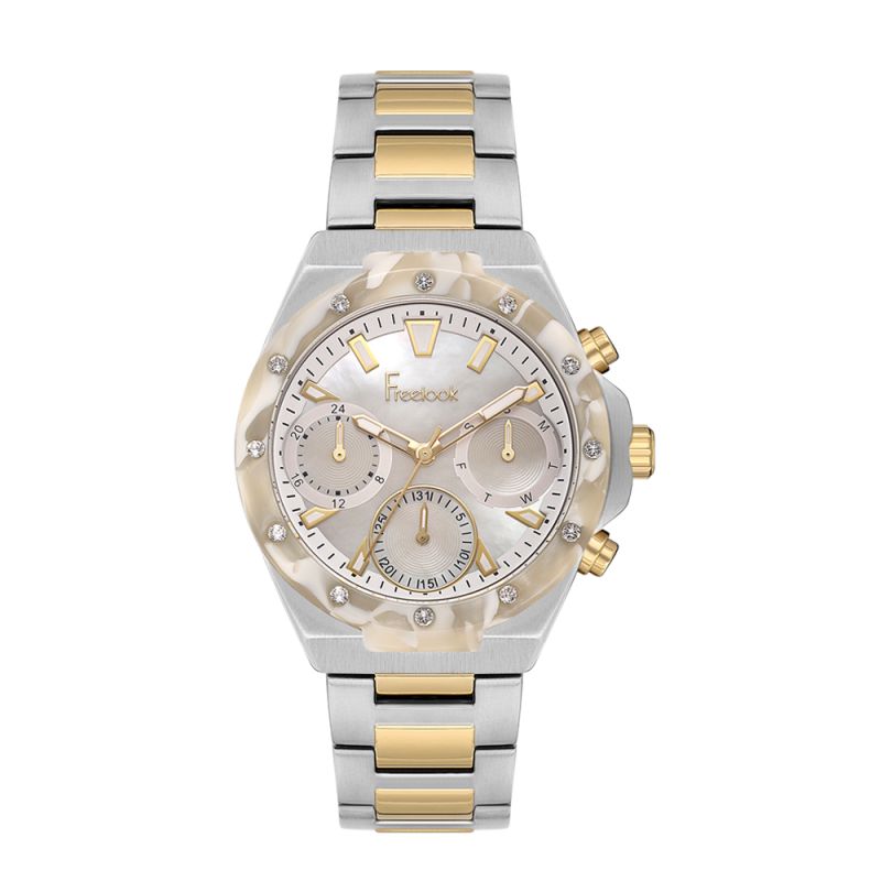 Дамски часовник Freelook със спортно-елегантен дизайн от колекцията Jolie. Моделът е със седефен мултифункционален дисплей и декорация от кристали по безела. Луминисцентно покритие върху стрелките и индексите. Стъклото е минерал-кристал. Корпусът и верижката са изработени от неръждаема стомана. Задвижва се от кварцов механизъм. Водоустойчивост 5 ATM - допускат се леки пръски и взимане на душ, не се препоръчва обилно мокрене.