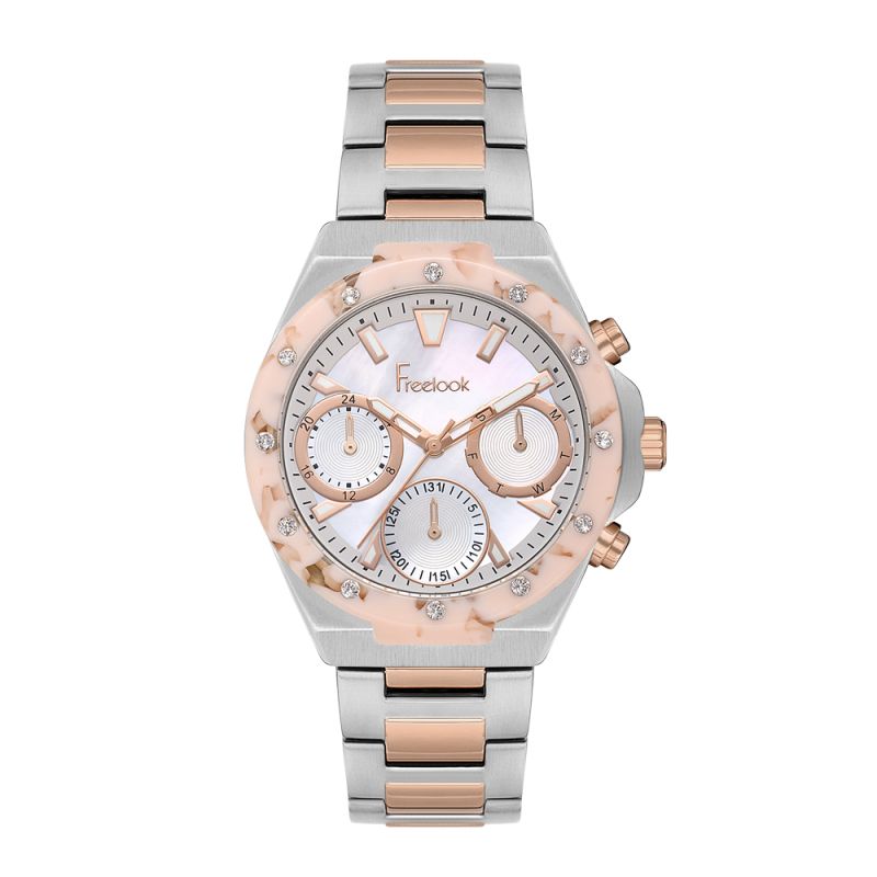 Дамски часовник Freelook със спортно-елегантен дизайн от колекцията Jolie. Моделът е със седефен мултифункционален дисплей и декорация от кристали по безела. Луминисцентно покритие върху стрелките и индексите. Стъклото е минерал-кристал. Корпусът и верижката са изработени от неръждаема стомана. Задвижва се от кварцов механизъм. Водоустойчивост 5 ATM - допускат се леки пръски и взимане на душ, не се препоръчва обилно мокрене.