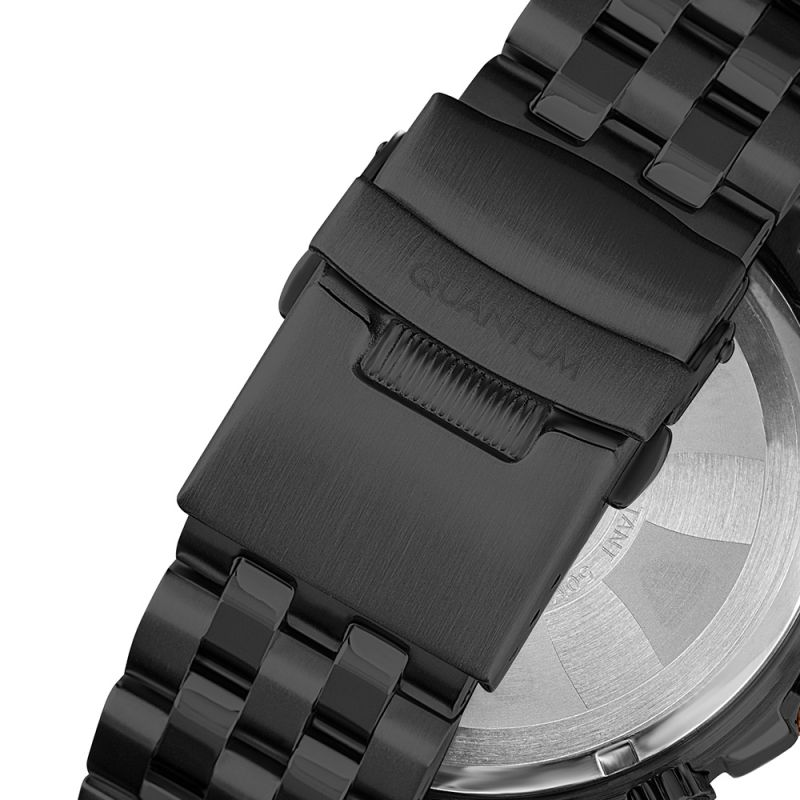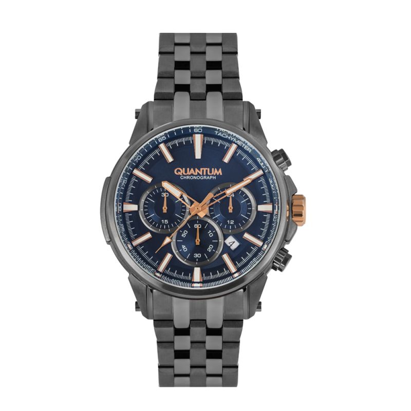Мъжки часовник Quantum със спортно-елегантен дизайн. Тъмносин дисплей хронограф с луминисцентно покритие на стрелките и индексите. Стъкло минерал-кристал с антирефлексно покритие. Корпус и верижка от неръждаема стомана. Часовникът се задвижва от кварцов механизъм. Водоустойчивост 10 ATM - позволява мокрене, къпане и плуване във водни басейни.