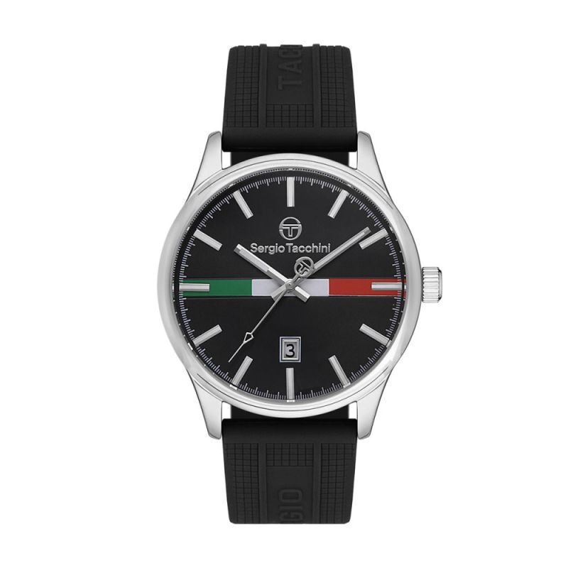 Мъжки часовник Sergio Tacchini от колекцията Coastlife. Моделът е с черен аналогов дисплей с показател за дата и италианското знаме в центъра. Корпус от неръждаема стомана, съчетан със силиконова каишка. Стъкло минерал-кристал. Задвижва се от кварцов механизъм. Водоустойчивост 5 ATM - допускат се леки пръски и взимане на душ, не се препоръчва обилно мокрене.