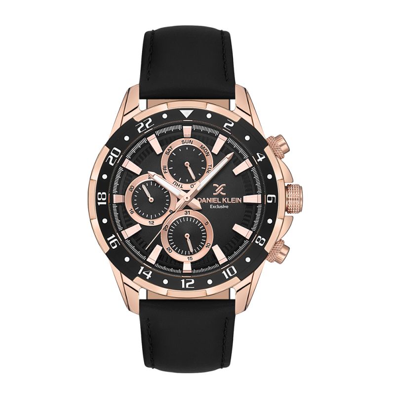 Мъжки часовник Daniel Klein със стилен дизайн от колекцията Exclusive. Черен мултифункционален дисплей с детайли в цвят розово злато. Стъкло минерал-кристал. Метален корпус. Каишка от естествена кожа. Задвижва се от кварцов механизъм. Водоустойчивост 5 ATM - допускат се леки пръски и взимане на душ, не се препоръчва обилно мокрене.