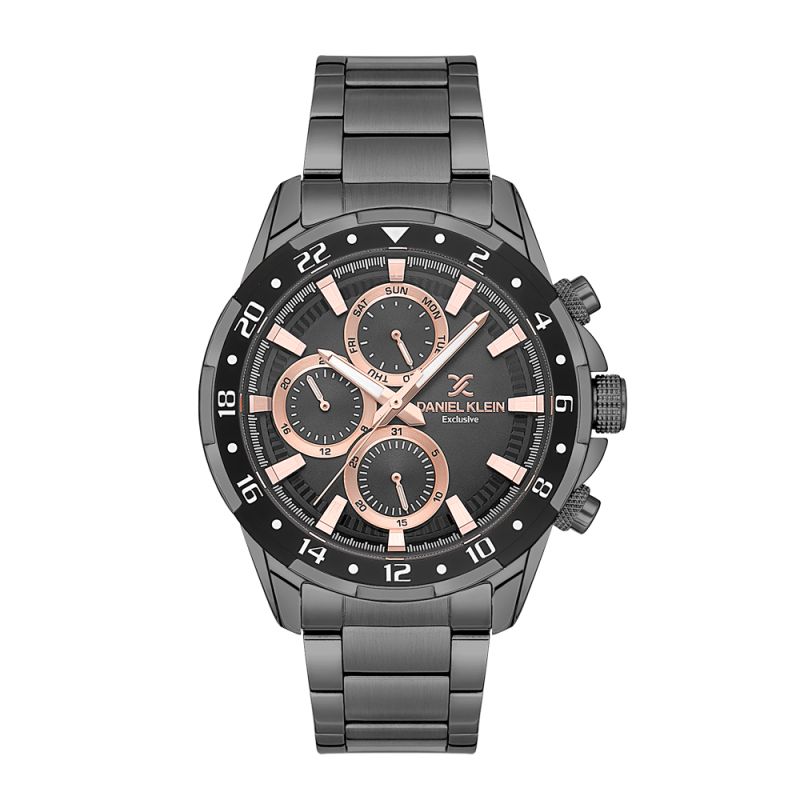 Мъжки часовник Daniel Klein със спортно-ежедневен дизайн от колекцията Exclusive. Черен мултифункционален дисплей с детайли в цвят злато. Стъкло минерал-кристал. Метален корпус в  комбинация с верижка от неръждаема стомана. Задвижва се от кварцов механизъм. Водоустойчивост 5 ATM - допускат се леки пръски и взимане на душ, не се препоръчва обилно мокрене.