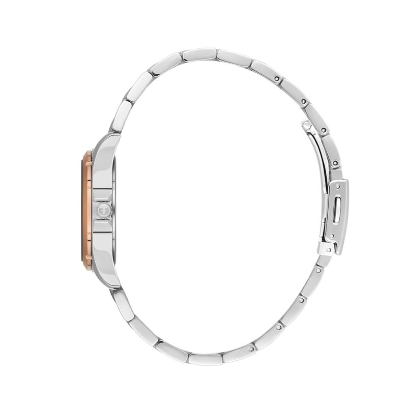 Класически модел дамски часовник Freelook от колекцията Jolie. Аналогов дисплей в седефен кафяв цвят с декорация от кристали върху индексите и луминисцентни стрелки. Стъкло минерал-кристал. Корпус и верижка от неръждаема стомана. Задвижва се от кварцов механизъм. Водоустойчивост 5 ATM - допускат се леки пръски и взимане на душ, не се препоръчва обилно мокрене.