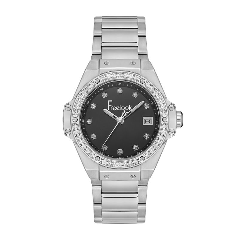 Елегантен дамски часовник Freelook от колекцията Charmant. Моделът е с черен аналогов дисплей с показател за дата и декорация от нежни кристали по безела и индексите. Луминисцентно покритие върху стрелките. Стъкло минерал-кристал. Корпусът и верижката са изработени от неръждаема стомана. Задвижва се от кварцов механизъм. Водоустойчивост 5 ATM - допускат се леки пръски и взимане на душ, не се препоръчва обилно мокрене.