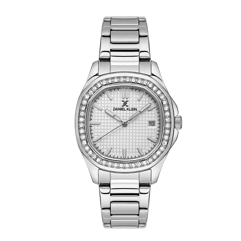 Дамски часовник Daniel Klein от колекцията Premium. Моделът е с аналогов дисплей с показател за дата и декорация от кристали по ринга. Стъкло минерал-кристал. Метален корпус в комбинация с верижка от неръждаема стомана. Кварцов механизъм. Водоустойчивост 3 ATM - допускат се леки пръски, не се препоръчва обилно мокрене.