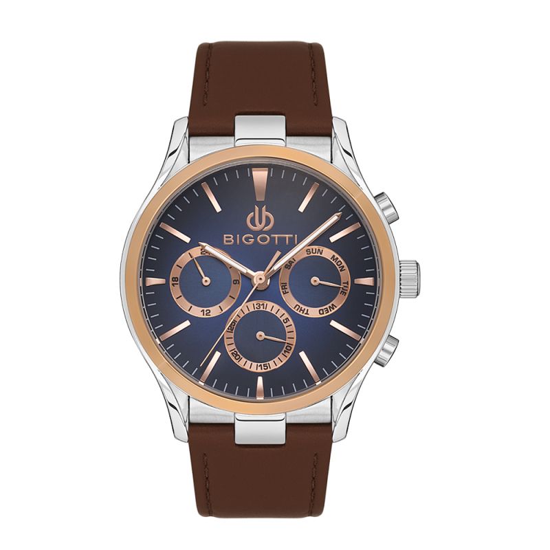 Стилен мъжки часовник Bigotti от колекцията Raffinato. Моделът е с метален корпус и каишка от естествена кожа. Мултифункционален дисплей с показатели за дата, ден и 24 часов формат. Стъкло минерал-кристал. Задвижва се от кварцов механизъм. Водоустойчивост 5 ATM - допускат се леки пръски и взимане на душ, не се препоръчва обилно мокрене.