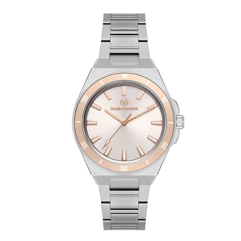 Класически модел дамски часовник Sergio Tacchini с модерен дизайн. Корпус и верижка от неръждаема стомана. Аналогов дисплей с луминисцентно покритие на стрелките и индексите. Минерално стъкло, устойчиво на надраскване. Кварцов механизъм. Водоустойчивост 5 ATM - допускат се леки пръски и взимане на душ, не се препоръчва обилно мокрене.