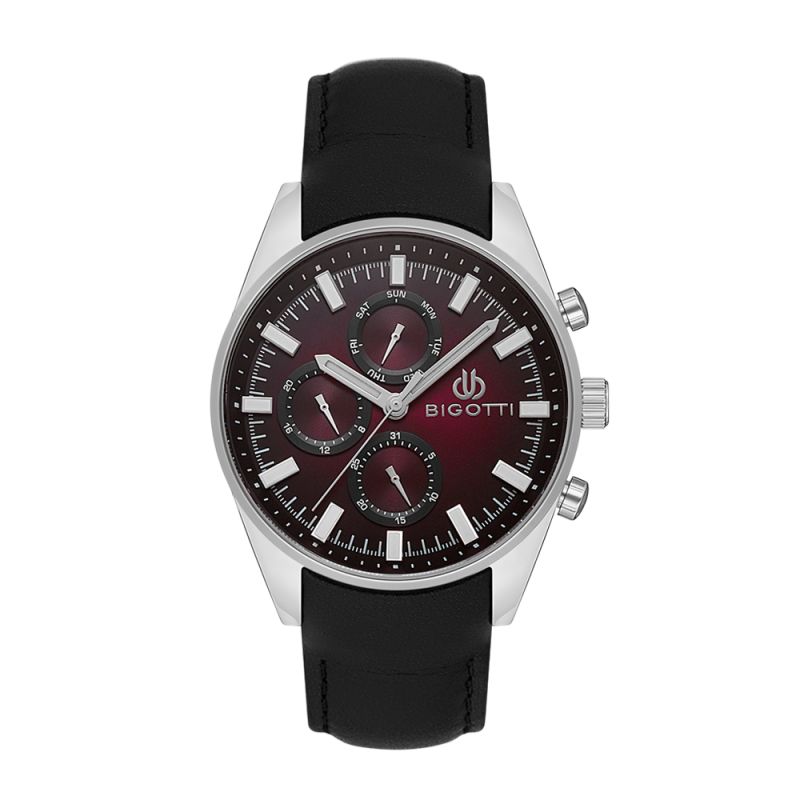 Мъжки часовник Bigotti със стилен дизайн. Метален корпус в комбинация с каишка от естествена кожа. Мултифункционален дисплей с луминисцентно покритие на стрелките и индексите. Стъкло минерал-кристал. Кварцов механизъм. Водоустойчивост 5 ATM - допускат се леки пръски и взимане на душ, не се препоръчва обилно мокрене.