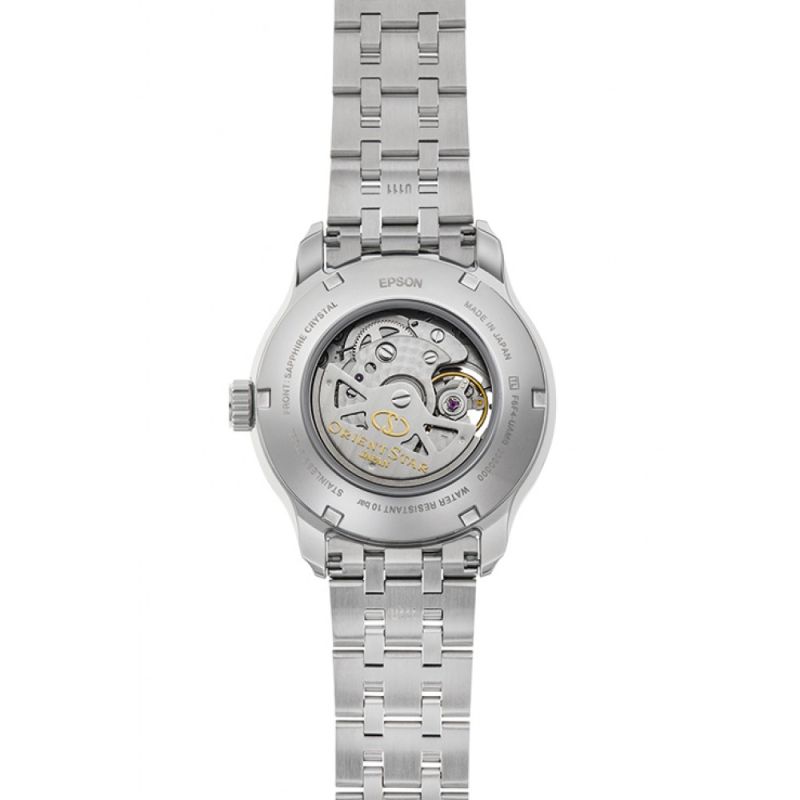 Класически модел мъжки часовник Orient Star с елегантен дизайн. Моделът е с полу-скелетонизиран дисплей с видим баланс, индикатор за резервна мощност и отделен секундарник. Корпусът и верижката са изработени от неръждаема стомана. Стъклото е сапфир-кристал с антирефлексно покритие. Часовникът се задвижва от японски автоматичен механизъм F6F44 с 24 камъка и 50 часа резервна мощност. Водоустойчивост 10 ATM - позволява мокрене, къпане и плуване във водни басейни.