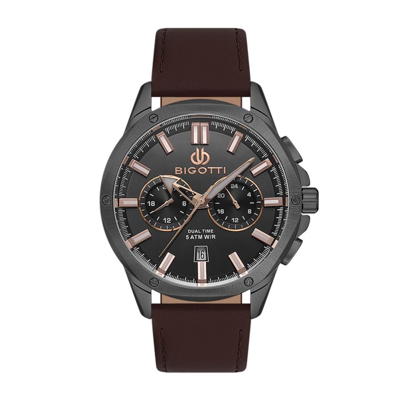 Мъжки часовник Bigotti със стилен дизайн от колекцията Quotidiano. Моделът е с метален корпус и каишка от естествена кожа. Мултифункционален дисплей с луминисцентно покритие на стрелките и индексите. Стъклото е минерал-кристал. Часовникът се задвижва от кварцов механизъм. Водоустойчивост 5 ATM - допускат се леки пръски и взимане на душ, не се препоръчва обилно мокрене.