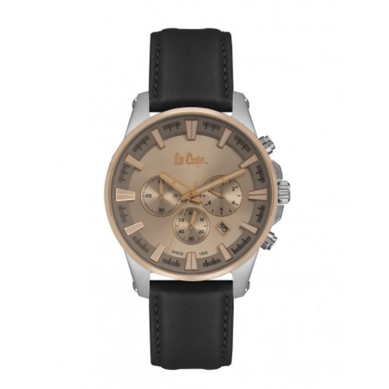 Мъжки часовник Lee Cooper с елегантна и модерна визия. Моделът е с минерално стъкло и златист дисплей хронограф. Черна каишка от естествена кожа. Корпус от супер метал. Задвижва се от кварцов механизъм. Водоустойчивост 3 ATM - допускат се леки пръски, не се препоръчва обилно мокрене.