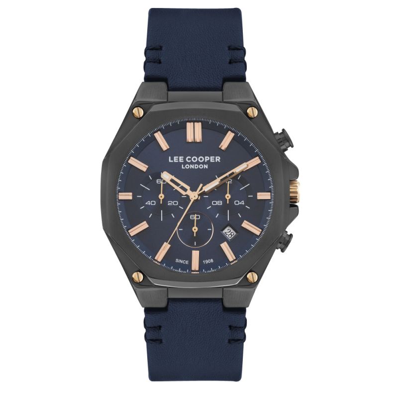 Спортно-елегантен мъжки часовник Lee Cooper с тъмносин хронограф дисплей. Моделът е с корпус от супер метал и каишка от естествена кожа. Стъкло минерал-кристал. Кварцов механизъм. Водоустойчивост 3 ATM - допускат се леки пръски, не се препоръчва обилно мокрене.