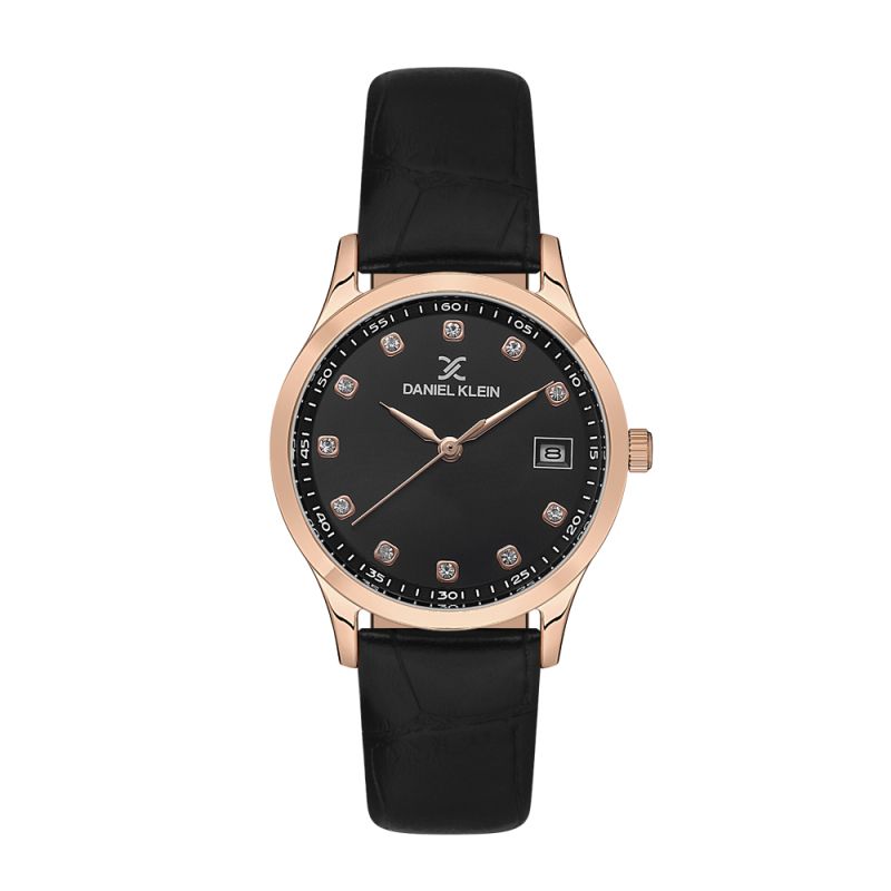 Стилен дамски часовник Daniel Klein от колекцията Premium. Аналогов дисплей с показател за дата и декорация от инкристирани кристали. Стъкло минерал-кристал. Метален корпус в комбинация с кожена каишка. Кварцов механизъм. Водоустойчивост 3 ATM - допускат се леки пръски, не се препоръчва обилно мокрене.