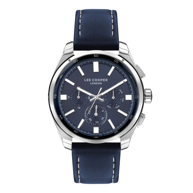 Спортно-елегантен мъжки часовник Lee Cooper. Моделът е с мултифункционален дисплей, съчетан с каишка от естествена кожа. Корпус от супер метал и стъкло минерал-кристал. Задвижва се от кварцов механизъм. Водоустойчивост 5 ATM - допускат се леки пръски и взимане на душ, не се препоръчва обилно мокрене.