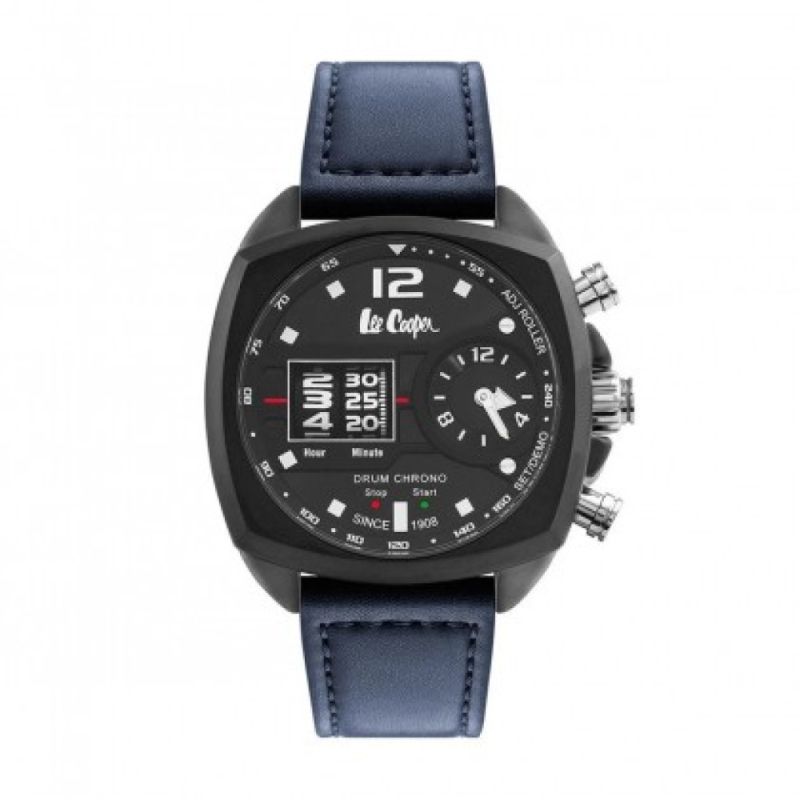 Спортно-елегантен мъжки часовник Lee Cooper от колекцията Drum Chrono. Черен дисплей с интересен начин за показване на времето и хронограф. Тъмносиня каишка от естествена кожа. Корпус от супер метал. Стъкло минерал-кристал. Задвижва се от кварцов механизъм. Водоустойчивост 3 ATM - допускат се леки пръски, не се препоръчва обилно мокрене.