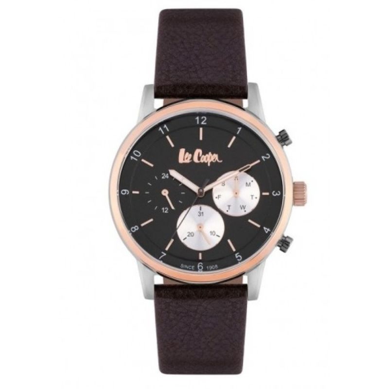 Мъжки часовник Lee Cooper от колекцията Classic Multifunction. Моделът е с тъмнокафява каишка от естествена кожа. Корпус от супер метал. Стъкло минерал-кристал. Мултифункционален дисплей. Задвижва се от кварцов механизъм. Водоустойчивост 3 ATM - допускат се леки пръски, не се препоръчва обилно мокрене.