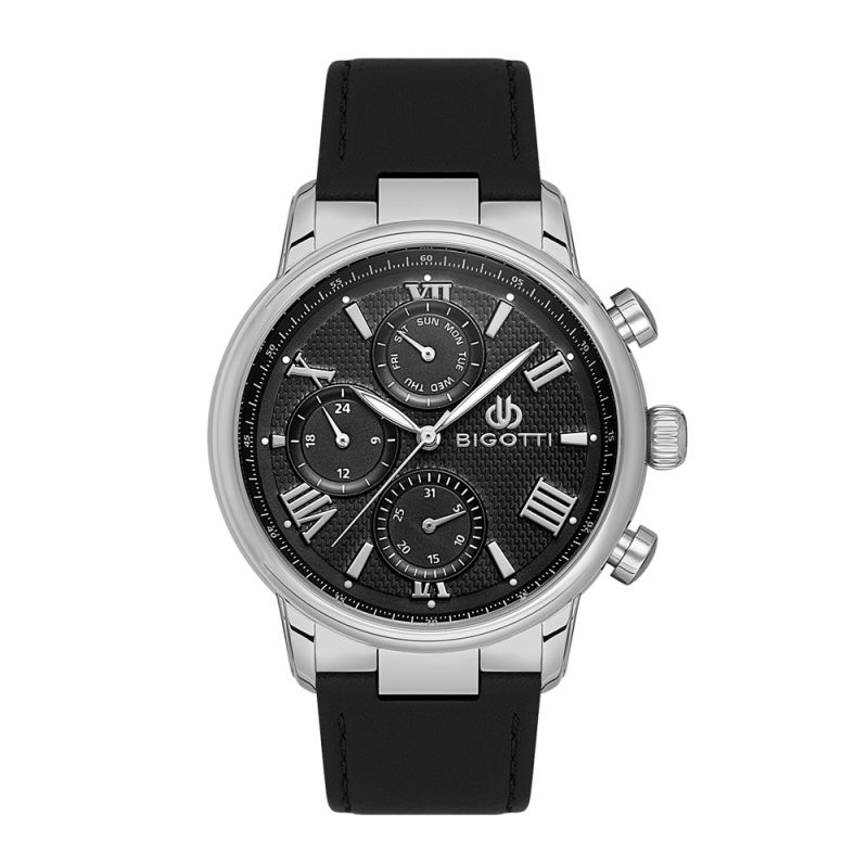 Стилен мъжки часовник Bigotti с мултифункционален дисплей. Стъкло минерал-кристал. Моделът е с метален корпус и каишка от естествена кожа. Задвижва се от кварцов механизъм. Водоустойчивост 5 ATM - допускат се леки пръски и взимане на душ, не се препоръчва обилно мокрене.