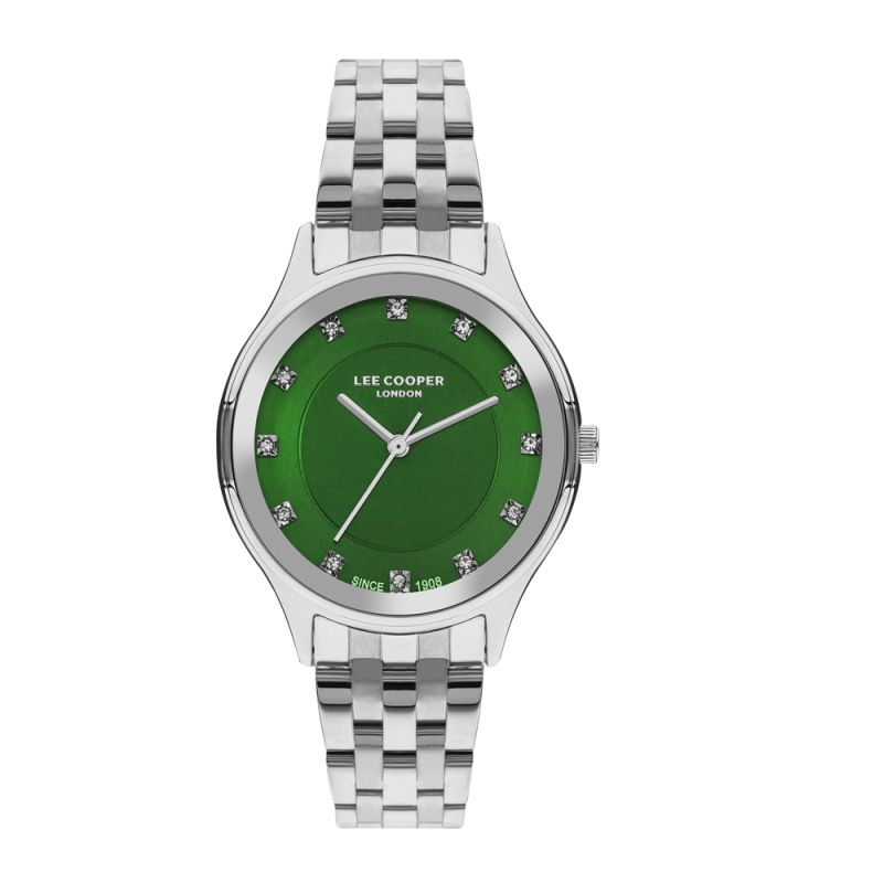 Дамски часовник Lee Cooper от колекцията Elegance. Зелен аналогов дисплей със сребристи стрелки и нежни кристали по индексите. Стъкло минерал-кристал. Корпус от супер метал в комбинация с метална верижка. Задвижва се от кварцов механизъм. Водоустойчивост 3 ATM - допускат се леки пръски, не се препоръчва обилно мокрене.