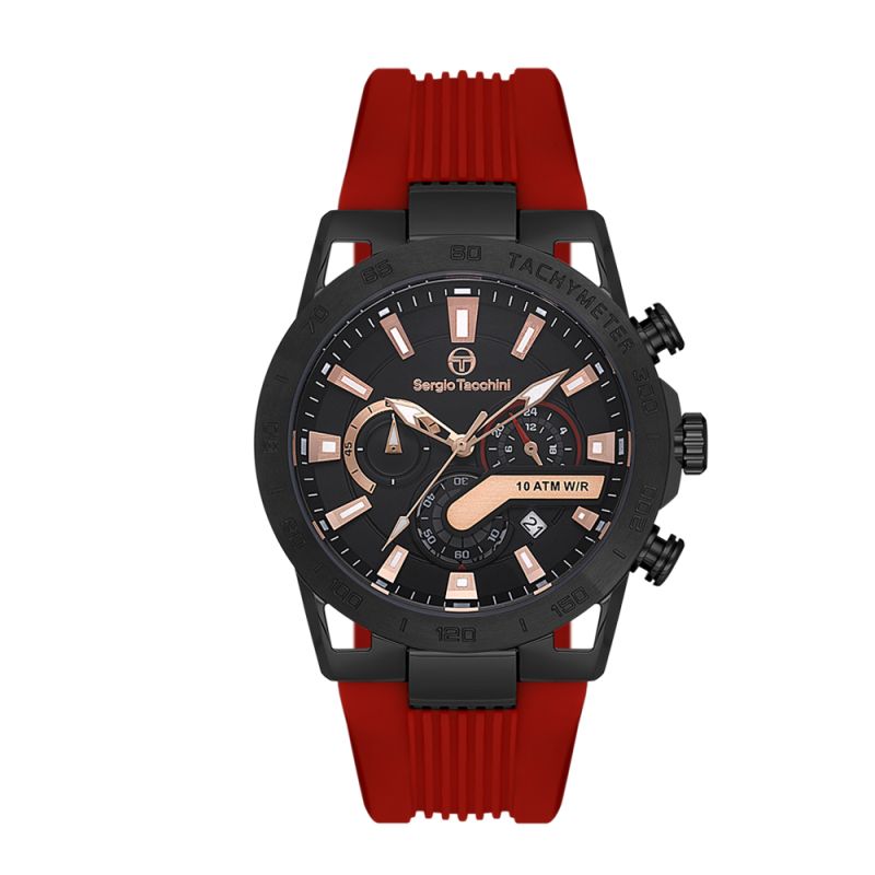 Спортен модел мъжки часовник Sergio Tacchini с дисплей хронограф. Корпус от неръждаема стомана, съчетан със силиконова каишка. Стъкло минерал-кристал. Задвижва се от кварцов механизъм. Водоустойчивост 10 ATM - позволява мокрене, къпане и плуване във водни басейни.