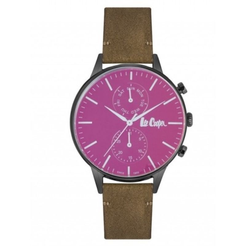 Мъжки часовник Lee Cooper от колекцията Classic Multifunction. Моделът е със стъкло минерал-кристал в червен цвят. Дисплей с показатели за дата и ден. Корпус изработен от супер метал. Кафява кожена каишка. Задвижва се от кварцов механизъм. Водоустойчивост 3 ATM - допускат се леки пръски, не се препоръчва обилно мокрене.
