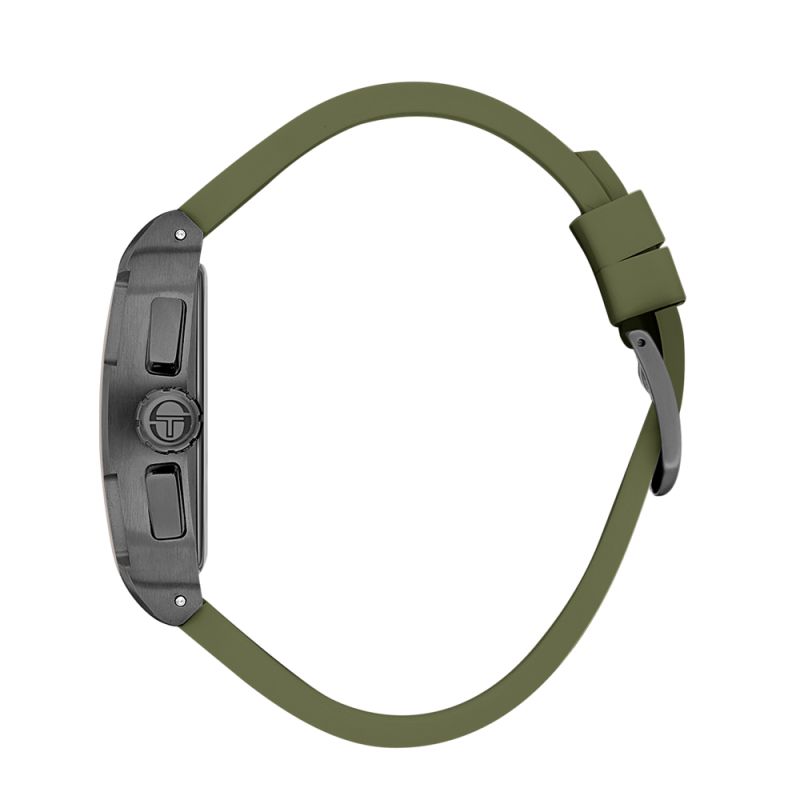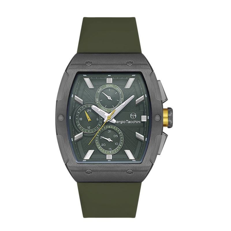 Мъжки часовник Sergio Tacchini с модерен спортно-елегантен дизайн. Моделът е с мултифункционален дисплей и минерално стъкло. Корпус изработен от неръждаема стомана. Силиконова каишка. Кварцов механизъм. Водоустойчивост 5 ATM - допускат се леки пръски и взимане на душ, не се препоръчва обилно мокрене.