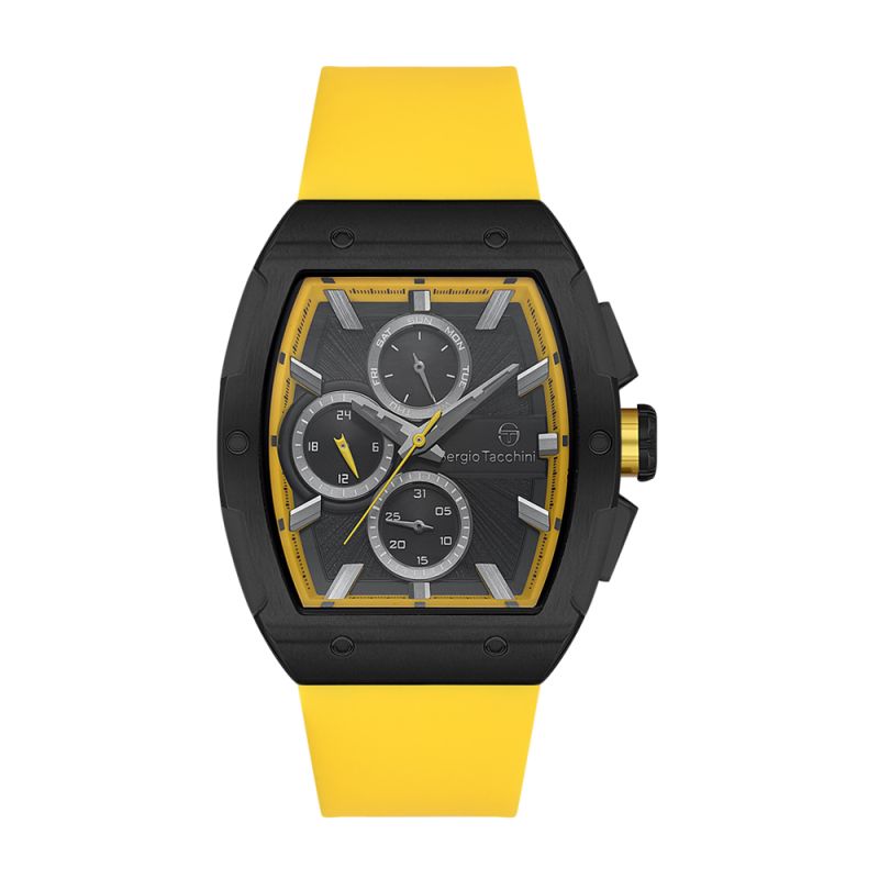 Мъжки часовник Sergio Tacchini с модерен спортно-елегантен дизайн. Моделът е с мултифункционален дисплей и минерално стъкло. Корпус изработен от неръждаема стомана. Жълта силиконова каишка. Кварцов механизъм. Водоустойчивост 5 ATM - допускат се леки пръски и взимане на душ, не се препоръчва обилно мокрене.