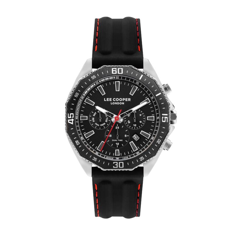 Стилен мъжки часовник Lee Cooper с мултифункционален дисплей. Стъкло минерал-кристал. Корпус изработен от супер метал. Черна силиконова каишка с червен декоративен шев. Кварцов механизъм. Водоустойчивост 5 ATM - допускат се леки пръски и взимане на душ, не се препоръчва обилно мокрене.