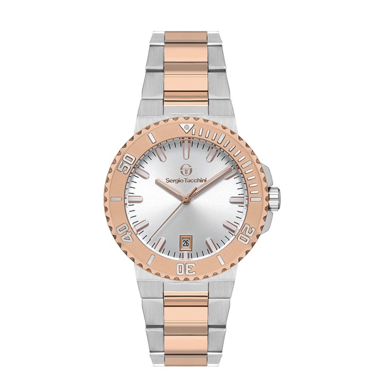 Класически модел дамски часовник Sergio Tacchini със стилен дизайн. Корпус и верижка от неръждаема стомана. Сребрист аналогов дисплей с показател за дата. Луминисцентно покритие на стрелките и индексите. Стъкло минерал-кристал. Кварцов механизъм. Водоустойчивост 5 ATM - допускат се леки пръски и взимане на душ, не се препоръчва обилно мокрене.
