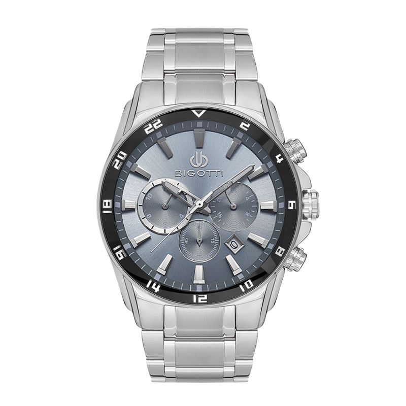 Мъжки часовник Bigotti със спортно-елегантен дизайн от колекцията Raffinato. Моделът е с мултифункционален дисплей и стъкло минерал-кристал. Метален корпус в комбинация с верижка от неръждаема стомана. Часовникът се задвижва от кварцов механизъм. Водоустойчивост 5 ATM - допускат се леки пръски и взимане на душ, не се препоръчва обилно мокрене.