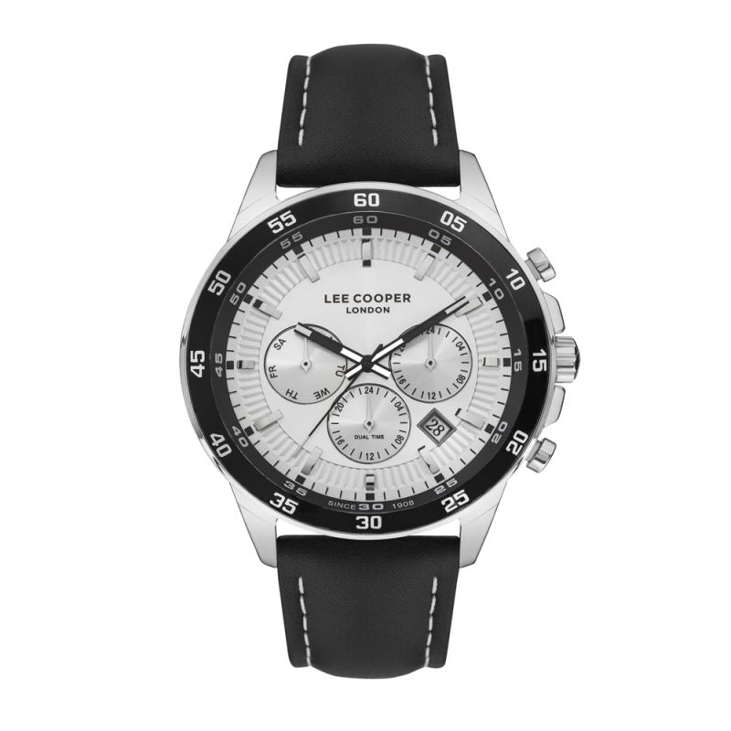 Мъжки спортно-елегантен часовник Lee Cooper с мултифункционален дисплей. Моделът е с корпус изработен от специална сплав - супер метал. Каишка от естествена кожа. Стъкло минерал-кристал. Кварцов механизъм. Водоустойчивост 5 ATM - допускат се леки пръски и взимане на душ, не се препоръчва обилно мокрене.