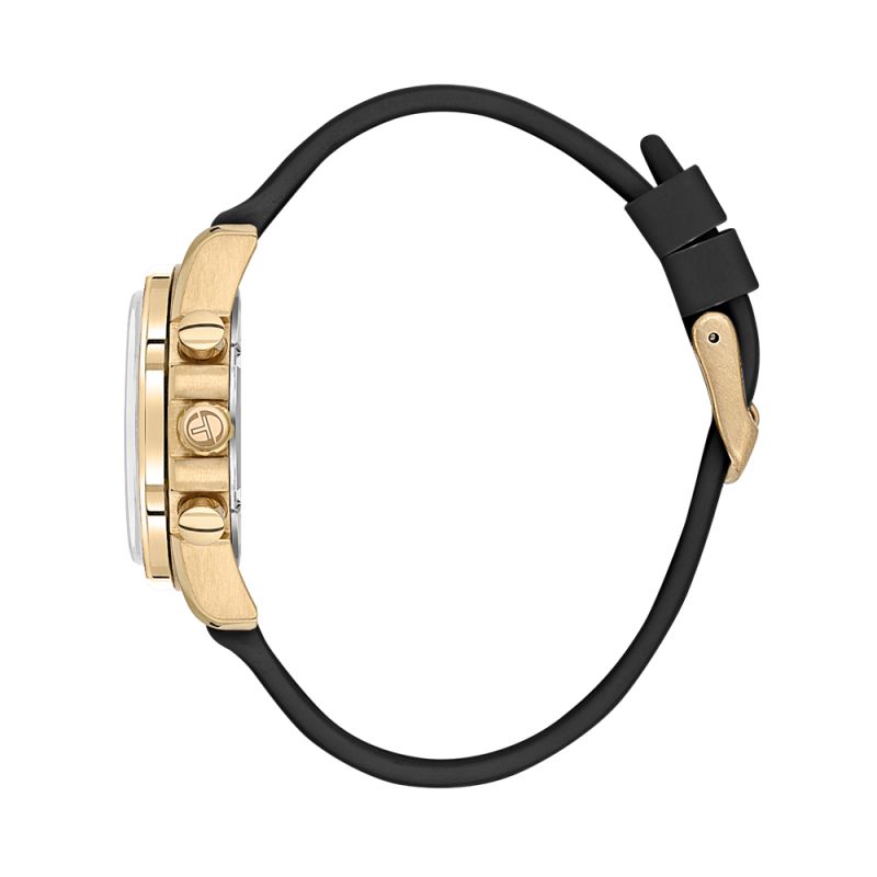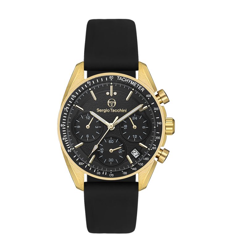 Дамски часовник Sergio Tacchini с дисплей тип хронограф. Моделът е с корпус от неръждаема стомана и силиконова каишка. Стъкло минерал-кристал. Задвижва се от кварцов механизъм. Водоустойчивост 5 ATM - допускат се леки пръски и взимане на душ, не се препоръчва обилно мокрене.