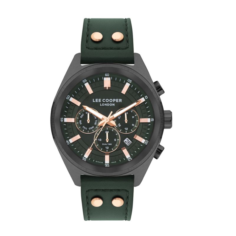 Спортно-елегантен мъжки часовник Lee Cooper с мултифункционален дисплей. Стъкло минерал-кристал. Корпус от супер метал в комбинация с каишка от естествена кожа. Задвижва се от кварцов механизъм. Водоустойчивост 5 ATM - допускат се леки пръски и взимане на душ, не се препоръчва обилно мокрене.