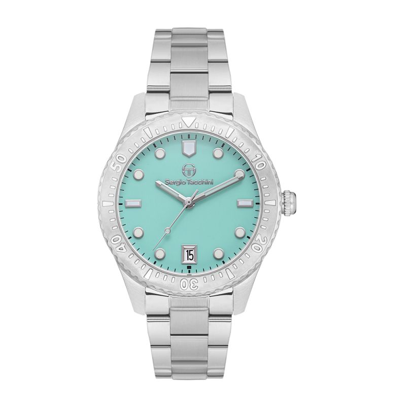 Класически модел дамски часовник Sergio Tacchini със стилен дизайн. Корпус и верижка от неръждаема стомана. Аналгов дисплей в тюркоазен цвят с показател за дата. Луминисцентно покритие на стрелките и индексите. Стъкло минерал-кристал. Кварцов механизъм. Водоустойчивост 5 ATM - допускат се леки пръски и взимане на душ, не се препоръчва обилно мокрене.