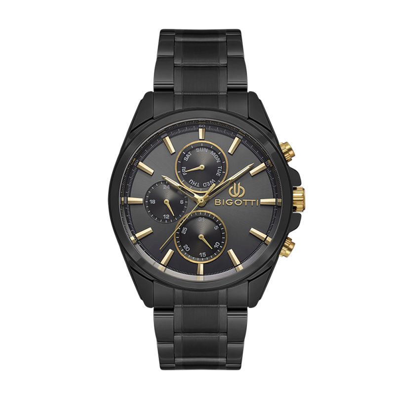 Мъжки часовник Bigotti със спортно-ежедневен дизайн. Черен мултифункционален дисплей с показатели за дата, ден от седмицата и 24 часов формат. Стъкло минерал-кристал. Метален корпус в комбинация с верижка от неръждаема стомана. Задвижва се от кварцов механизъм. Водоустойчивост 5 ATM - допускат се леки пръски и взимане на душ, не се препоръчва обилно мокрене.
