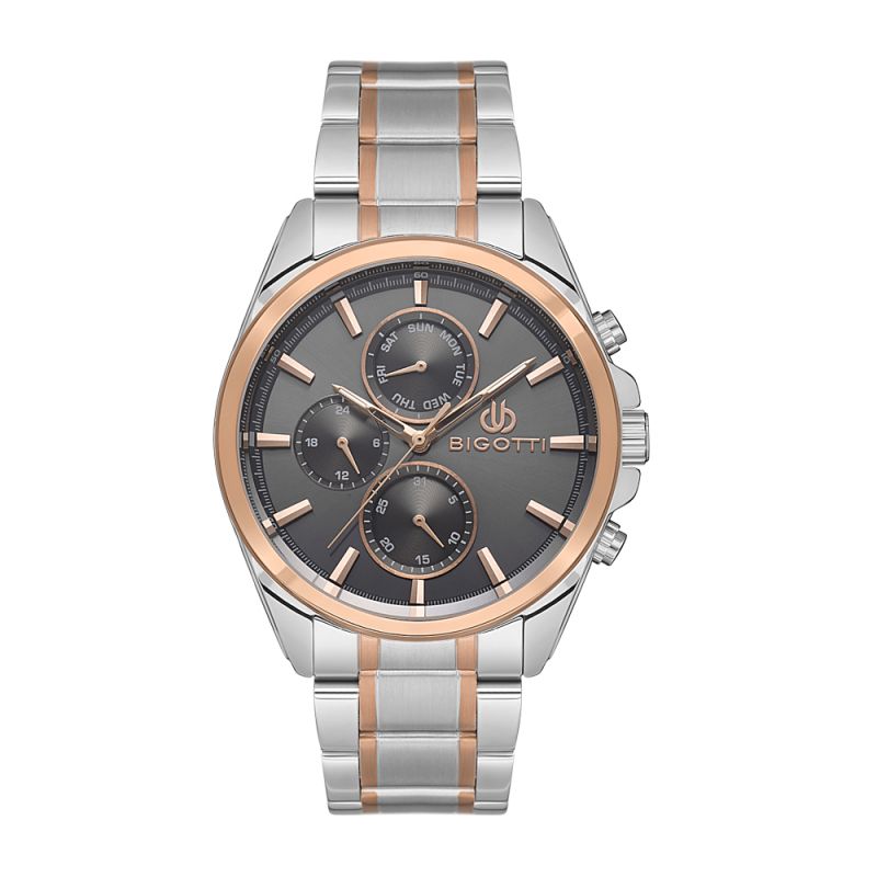 Мъжки часовник Bigotti със спортно-ежедневен дизайн. Мултифункционален дисплей с показатели за дата, ден от седмицата и 24 часов формат. Стъкло минерал-кристал. Метален корпус в комбинация с верижка от неръждаема стомана. Задвижва се от кварцов механизъм. Водоустойчивост 5 ATM - допускат се леки пръски и взимане на душ, не се препоръчва обилно мокрене.