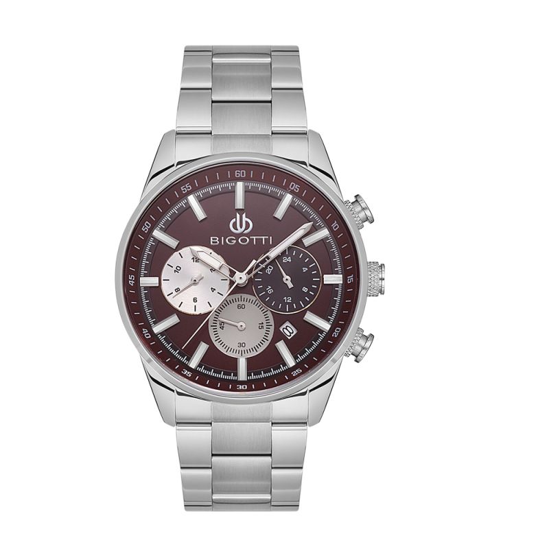 Страхотен модел мъжки часовник Bigotti с дисплей тип хронограф. Метален корпус в комбинация с верижка от неръждаема стомана. Стъкло минерал-кристал. Кварцов механизъм. Водоустойчивост 5 ATM - допускат се леки пръски и взимане на душ, не се препоръчва обилно мокрене.