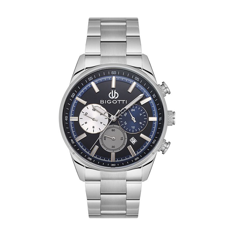 Страхотен модел мъжки часовник Bigotti с дисплей тип хронограф. Метален корпус в комбинация с верижка от неръждаема стомана. Стъкло минерал-кристал. Кварцов механизъм. Водоустойчивост 5 ATM - допускат се леки пръски и взимане на душ, не се препоръчва обилно мокрене.